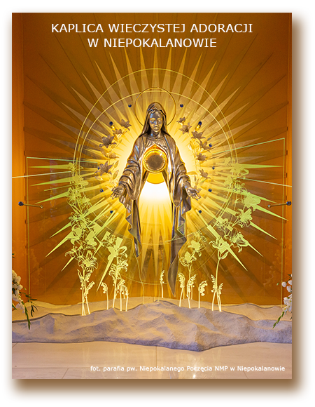 Uwielbiam Cię Stwórco i Panie, utajony w Najświętszym Sakramencie. Uwielbiam Cię za wszystkie dzieła rąk Twoich, w których mi się ukazuje tyle mądrości, dobroci i miłosierdzia, o Panie, rozsiałeś tyle piękna na ziemi, a ono mi mówi o piękności Twojej, choć są tylko słabym odbiciem Ciebie, Niepojęta Piękności. Choć ukryłeś i utaiłeś piękność Swoją, oko moje oświecone wiarą dosięga Ciebie i dusza moja poznaje Stwórcę swego, najwyższe swe dobro i serce moje całe tonie w modlitwie uwielbienia. Stwórco mój i Panie, Twoja dobroć ośmieliła mnie mówić z Tobą - miłosierdzie Twoje sprawia to, że znika pomiędzy nami przepaść, która dzieli Stwórcę od stworzenia. Rozmawiać z Tobą o Panie, to rozkosz dla mojego serca, w Tobie znajduję wszystko, czego serce moje zapragnąć może. Tu światło Twoje oświeca mój umysł i czyni go zdolnym do coraz głębszego poznawania Ciebie. Tu na serce moje spływają łask strumienie, tu dusza moja czerpie życie wiekuiste. Amen. (Dz 1692)
